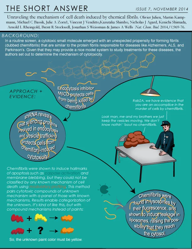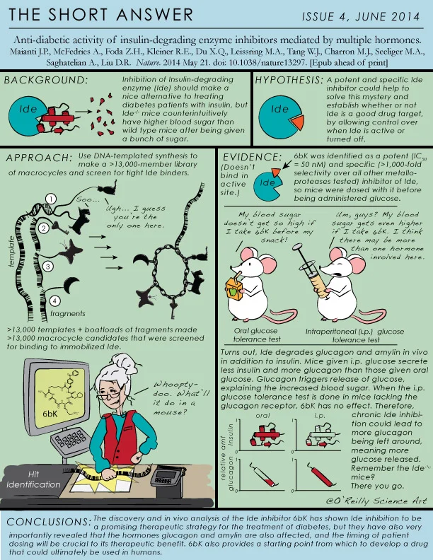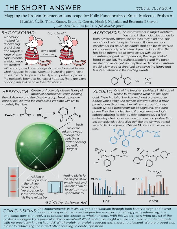 A bimonthly comic that highlights recent papers in the field of chemical biology. I started it just for fun because I was missing journal clubs now that I'm out of the lab. The target audience is people who might read these papers, but I hope that anyone could get something out of them.