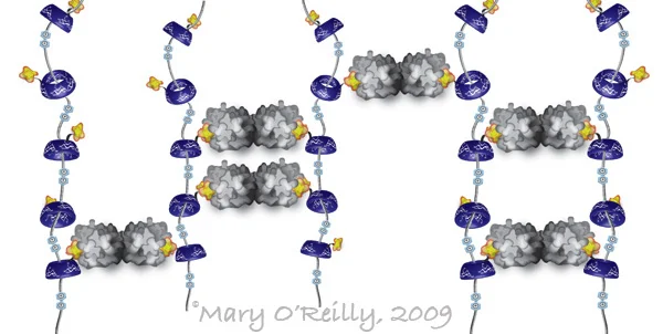 When I was a postdoc in Jim Paulson's lab studying multivalency in protein-carbohydrate interactions, I was invited to the Frie Universitat in Berlin to give two talks, one about multivalency in nature and chemical methods to mimic it, and one specific to my own research. I made the illustration below for the former, to describe a self-assembled pseudopolyrotaxane, often described as the molecular equivalent of beads on a string. It was developed in the lab of Fraser Stoddard, one of the three winners of the Nobel Prize in Chemistry that was just announced. In this collaboration with Linda Baum's group, they built a scaffold of the pseudopolyrotaxane that multivalently displayed a carbohydrate ligand (in yellow), and precipitated its dimeric cognate lectin, galectin (in gray), by forming cross-links like you see in the illustration. The circles you see in between the "beads" are positive charges that act as speed bumps, to stall the beads from just falling off of the string. I remember thinking that this was incredibly cool, and in retrospect apparently just the kind of ingenuity that puts you in line for a Nobel Prize. Looking back on this illustration reminds me of how immensely satisfying I found it to create all of these new illustrations for my talks. I was just on the cusp of letting go of the idea of an academic career in favor of, for lack of a less cliché phrase, following my dream. But at the time I was my only client, and I didn't pay well. Somehow I didn't enjoy it any less.